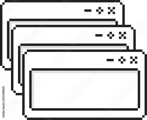 Three pixel art GUI frames are overlapping diagonally with control icons on transparent background