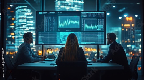 Three professionals analyze data on large screens in a modern office at night with a cityscape in the background.