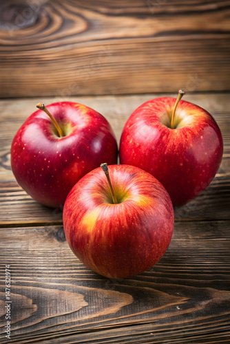 Three red apples on wooden surface