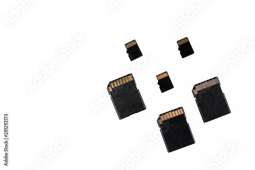 three sd cards and three micro sd scattered isolated in white background