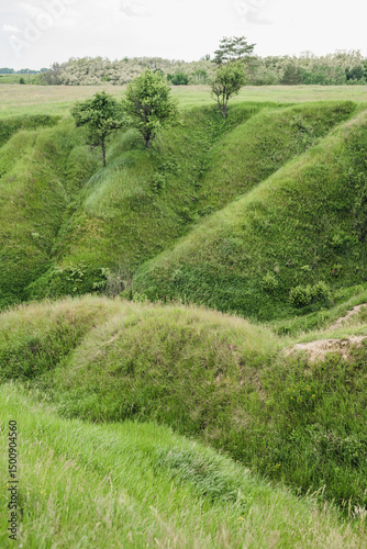 Three trees on steep grassy slopes
