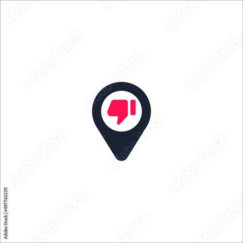 Thumb down icon on map pin. Location pointer isolated on a white background. Conceptual vector illustration.