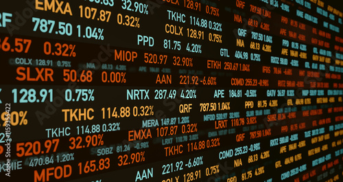 Ticker tape with prices and percentage changes. Stock market data, business, financial figures. Abstract financial market concept and 3D illustration