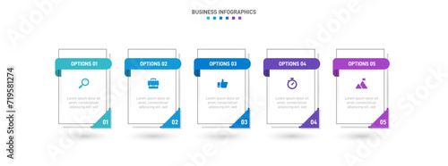 Timeline infographic with infochart. Modern presentation template with 5 spets for business process. Website template on white background for concept modern design. Horizontal layout.