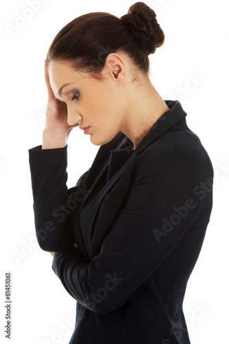 Tired businesswoman touching her head.