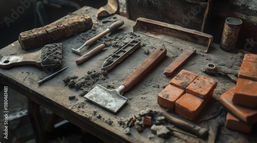 Tools and materials on a dusty workbench.