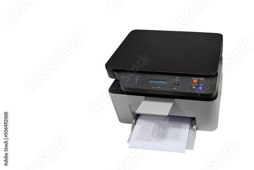 top view, black and white printer and paper on white background, technology, object, copy space
