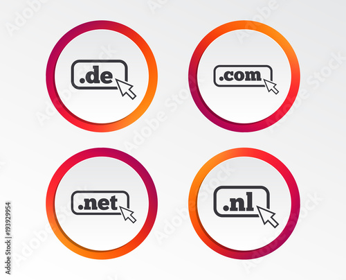 Top-level internet domain icons. De, Com, Net and Nl symbols with cursor pointer. Unique national DNS names. Infographic design buttons. Circle templates. Vector