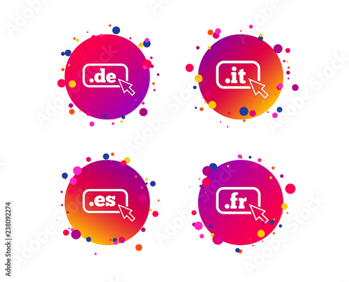 Top-level internet domain icons. De, It, Es and Fr symbols with cursor pointer. Unique national DNS names. Gradient circle buttons with icons. Random dots design. Vector