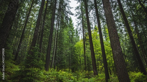 Towering Evergreens and the Scent of Pine Needles in a Serene Backdrop. Majestic Forest Scene with Rich Green Foliage and Calm Atmosphere.