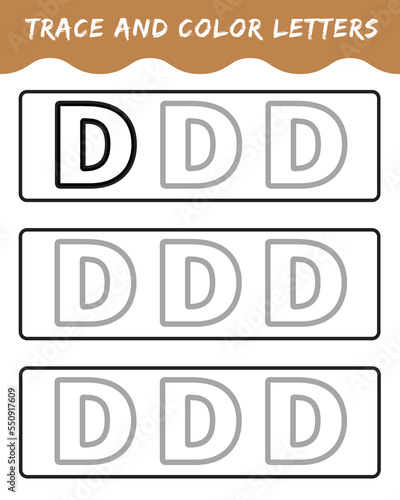 Trace letters for kindergarten and preschool kids. Write and color. Writing letters d. vector illustration.