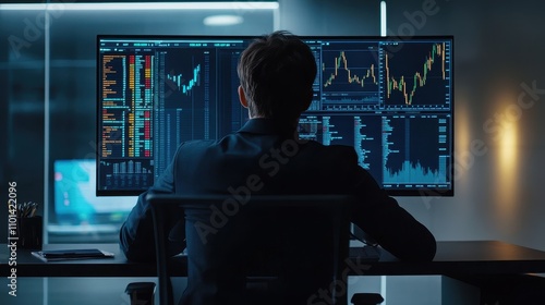 Trader Analyzing Financial Data on Multiple Displays