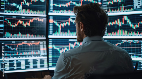Trader in front of computer screens with a clear uptrend candlestick graph. Generative AI.