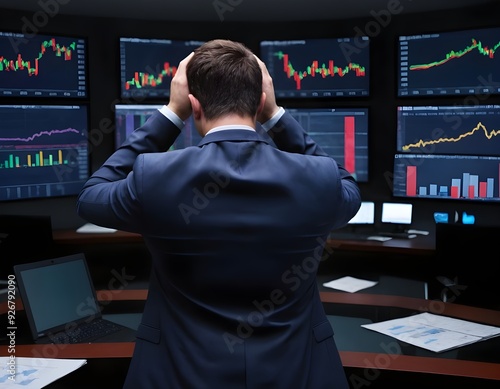 Trader stressed while analyzing market data on multiple screens in a trading room