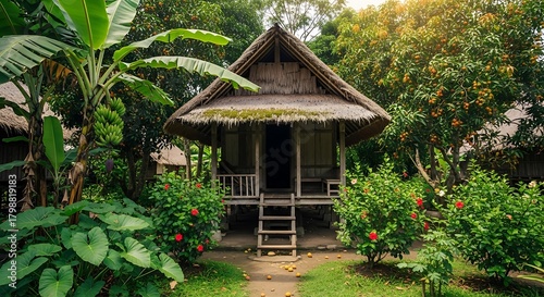 Traditional Hut in Lush Tropical Jungle Surrounded by Vibrant Greenery.