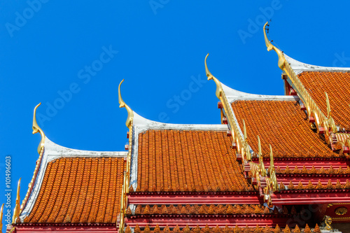 Traditional Thai style Stucco & Naga, Wood Carving Tympanum of Thai Roof Temple at Wat Benchamabopit Dusitvanaram in Bangkok, Thailand