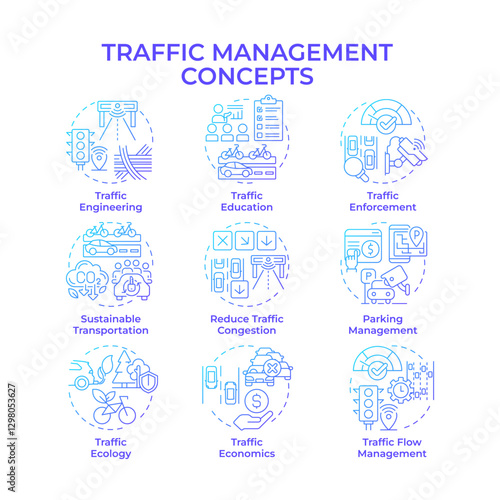 Traffic management blue gradient concept icons. Road safety and vehicle flow regulation. Transport control. Icon pack. Vector images. Round shape illustrations for presentation. Abstract idea