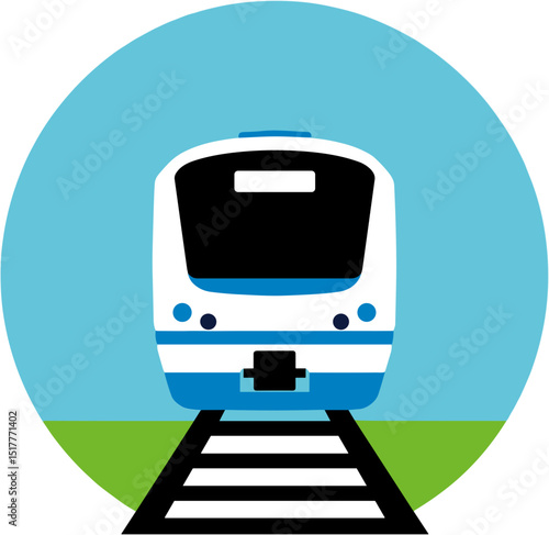 Train on tracks against a blue background with green grass
