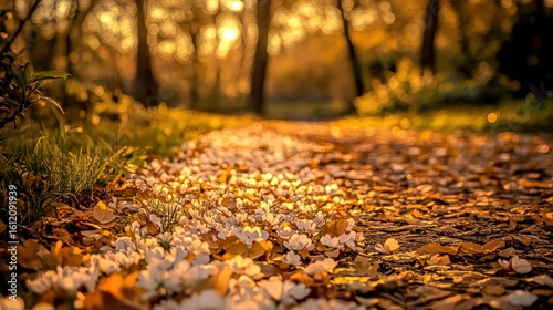 Tranquil Autumn Path with Fallen Leaves and Sunlit Background