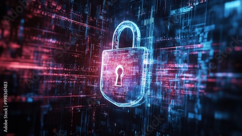 Translucent Digital Padlock and Binary Code Matrix in Cyber Security