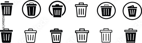 Trash Can Icons: A set of simple, monochrome trash can icons, each with a unique design and style. Ideal for use in web design, app development, and digital interfaces.