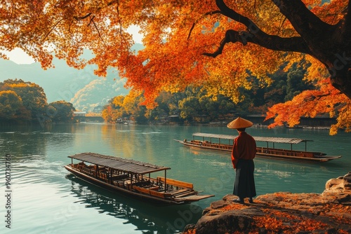 Travel boat on the river in Kyoto with autumn season background
