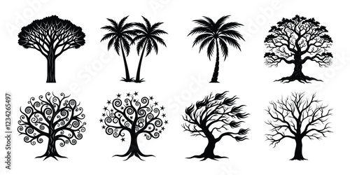 Tree silhouettes set. various trees bundle on white background