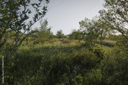 Trees and green grass. Thicket. Countryside landscape
