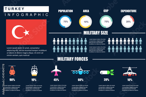 Turkey military size, weapon, population infographics template for statistics, charts, diagrams, graphs, report or presentation, banner. vector illustration