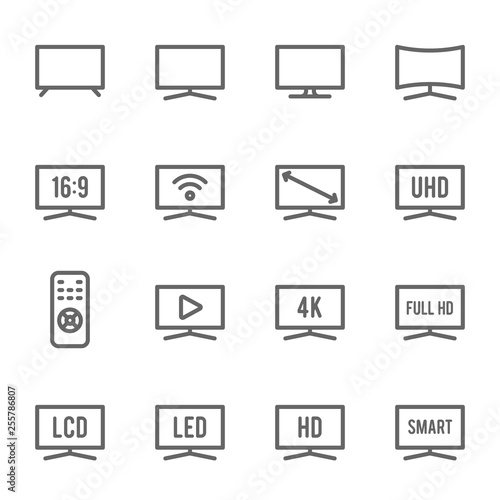 TV Icon Set. Contains such Icons as Monitor, Full HD, LCD, LED, 4K, HD and more. Expanded Stroke