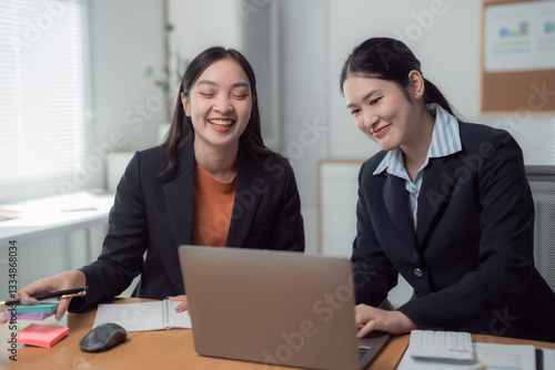 Two asian businesswomen are smiling and collaborating on a project, using a laptop in a bright and modern office environment, showcasing teamwork and productivity
