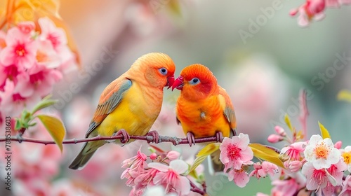 Two beautiful colorful birds with red beaks, sitting on the same branch of blooming flowers in spring, looking at each other and kissing