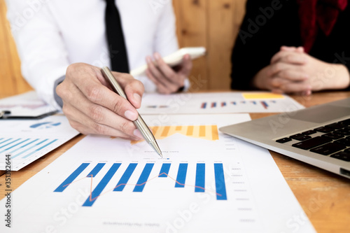 Two business people are presenting and discussing about business graph for sales plan in the office.