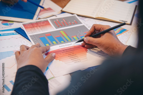 Two businesspeople meeting work at office desk. Teamwork partners team with Business strategy chart graph, infographic data financial report. Team partner planning marketing finance excel stat report