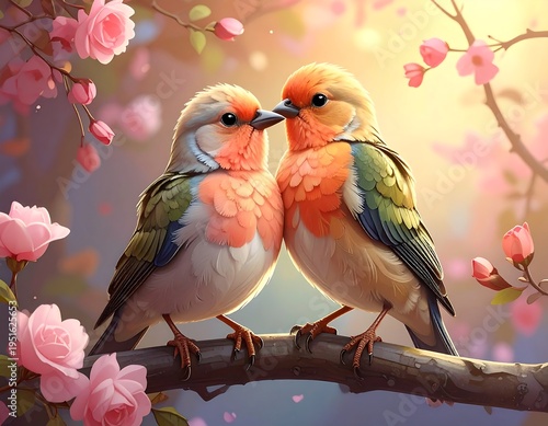 Two colorful birds perched together on a branch surrounded by pink blossoms, sunlit backdrop