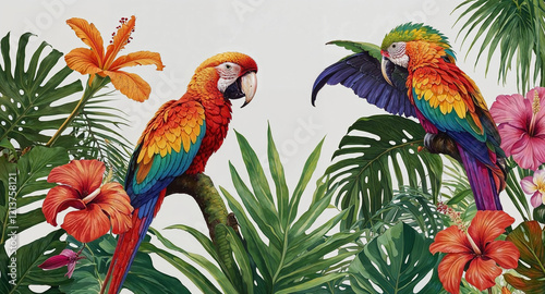 Two colorful parrots perched on a tree branch in a tropical setting