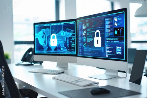 Two computer monitors and a keyboard on a desk