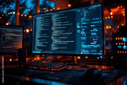 Two Computer Monitors Displaying Programming Code in a Dark Room with Warm Lights