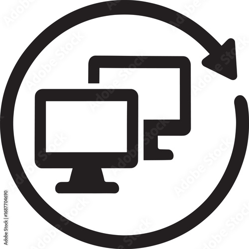 Two computers with circular arrow icon on white background screens connection