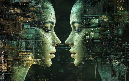 Two digital human faces merging, symbolizing the convergence of human cognition and technology in the digital age, interconnected circuits, hightech ambiance