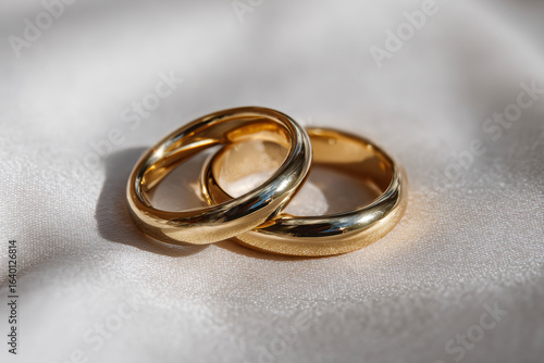 Two golden rings symbolize union, love, and commitment against a softly lit background.