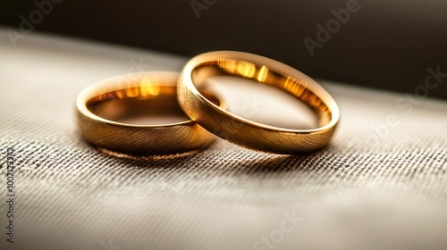 Two golden wedding rings resting on a white surface
