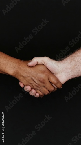 Two hands of different skin tones clasp together in a handshake against a black background, symbolizing unity and teamwork.