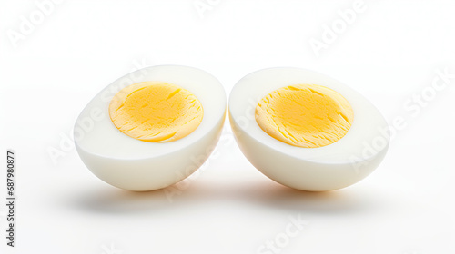 two hard boiled eggs split in half isolated on white background
