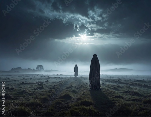 Two hooded figures traverse a misty field under a dramatic, moonlit sky