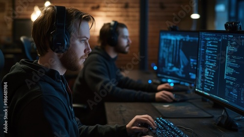 Two individuals are deeply engaged in programming tasks, surrounded by multiple computer monitors displaying code, in a contemporary office setting during nighttime