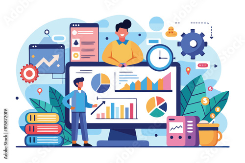 Two individuals are engaged in analyzing dynamic analytics data on a large computer screen while surrounded by various digital tools and office plants