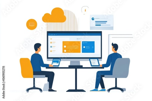 Two individuals collaborating at a large screen, showcasing data on devices, emphasizing teamwork and technology.