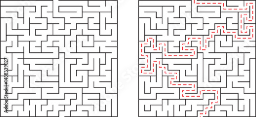 Two maze puzzles one unsolved and one with red line demonstrating the solution path