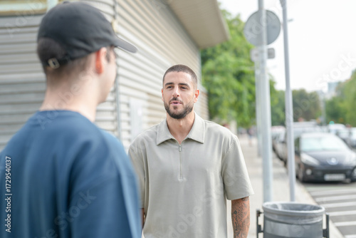 Two men are talking on the sidewalk. One of them is wearing a black hat. The other man is wearing a blue shirt